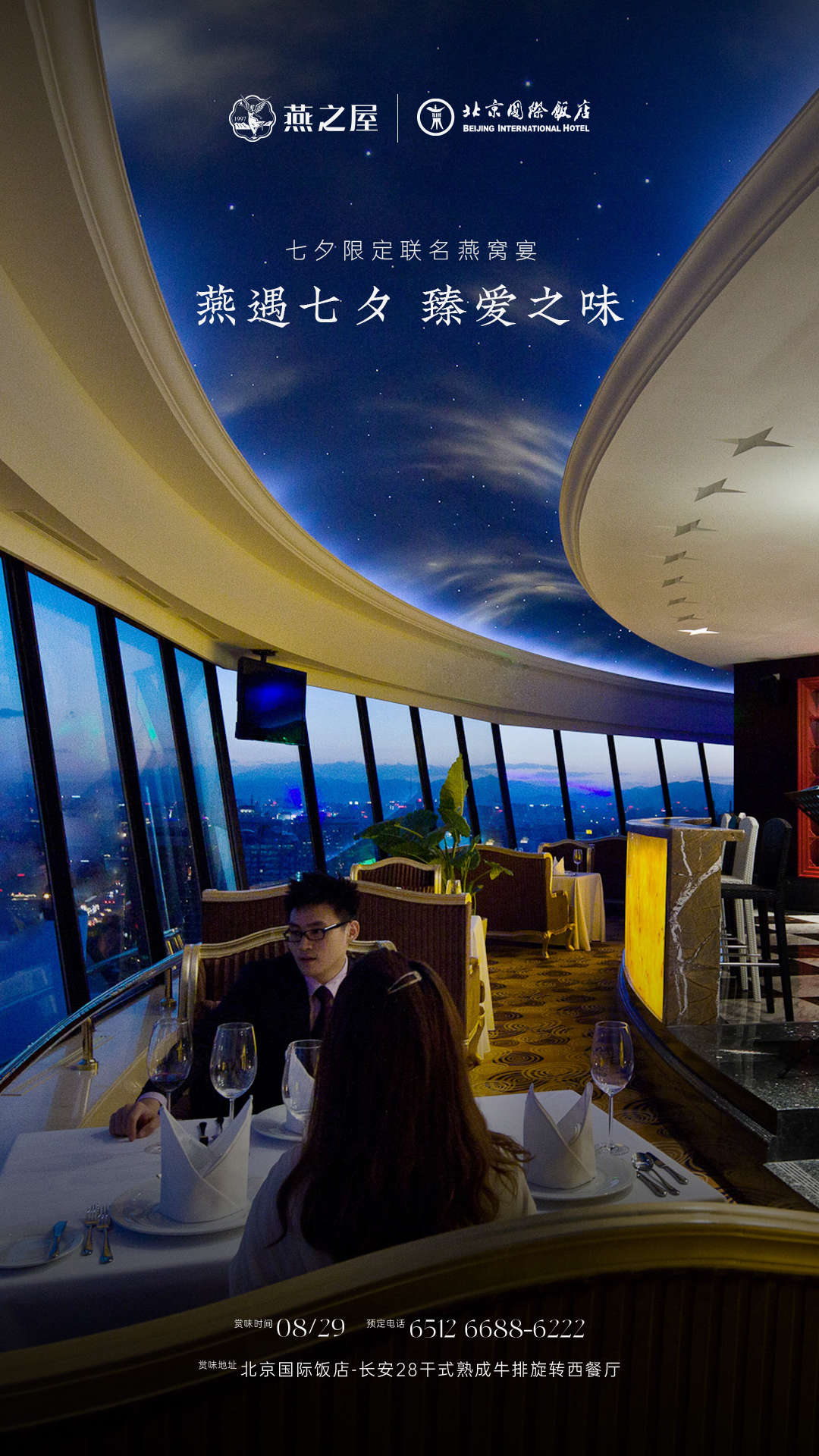 北京國(guó)際飯店長(zhǎng)安28餐廳作為北京市中心高空360度環(huán)瞰京城盛景的旋轉(zhuǎn)餐廳,以其獨(dú)特的奢華與雅致并存的裝修風(fēng)格,成為京城高端餐飲場(chǎng)所。604㎡餐廳空間、100個(gè)精致餐位,3間多功能廳房,配合專業(yè)的服務(wù)團(tuán)隊(duì),為每位賓客提供尊貴的用餐體驗(yàn)。燕之屋27年專注高品質(zhì)燕窩,始終堅(jiān)持“源于天然,美與健康”的理念,以創(chuàng)新科研賦能上乘品質(zhì),連續(xù)九年高端燕窩全國(guó)銷售第一①。此次合作是云端視野與輕奢品味的雙重尊享,正如每一對(duì)相約七夕的甜蜜愛侶。
